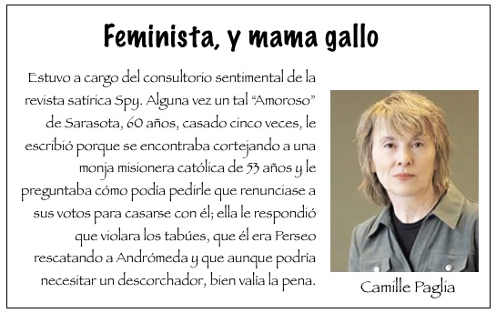 “La mujer debe ser maternal y no culpar al hombre por todo”. La frase, digna de cura pueblerino, es de Camille Paglia, feminista atea, pragmática, y azote de la militancia idealista.
